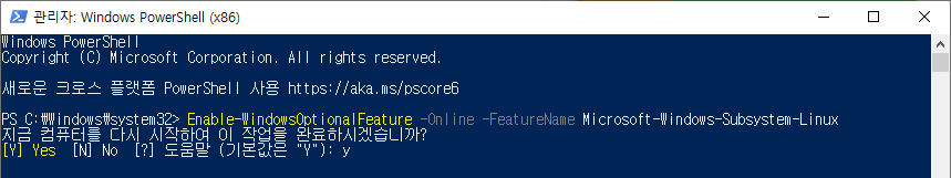 - "Enable-WindowsOptionalFeature -Online -FeatureName Microsoft-Windows-Subsystem-Linux" 실행